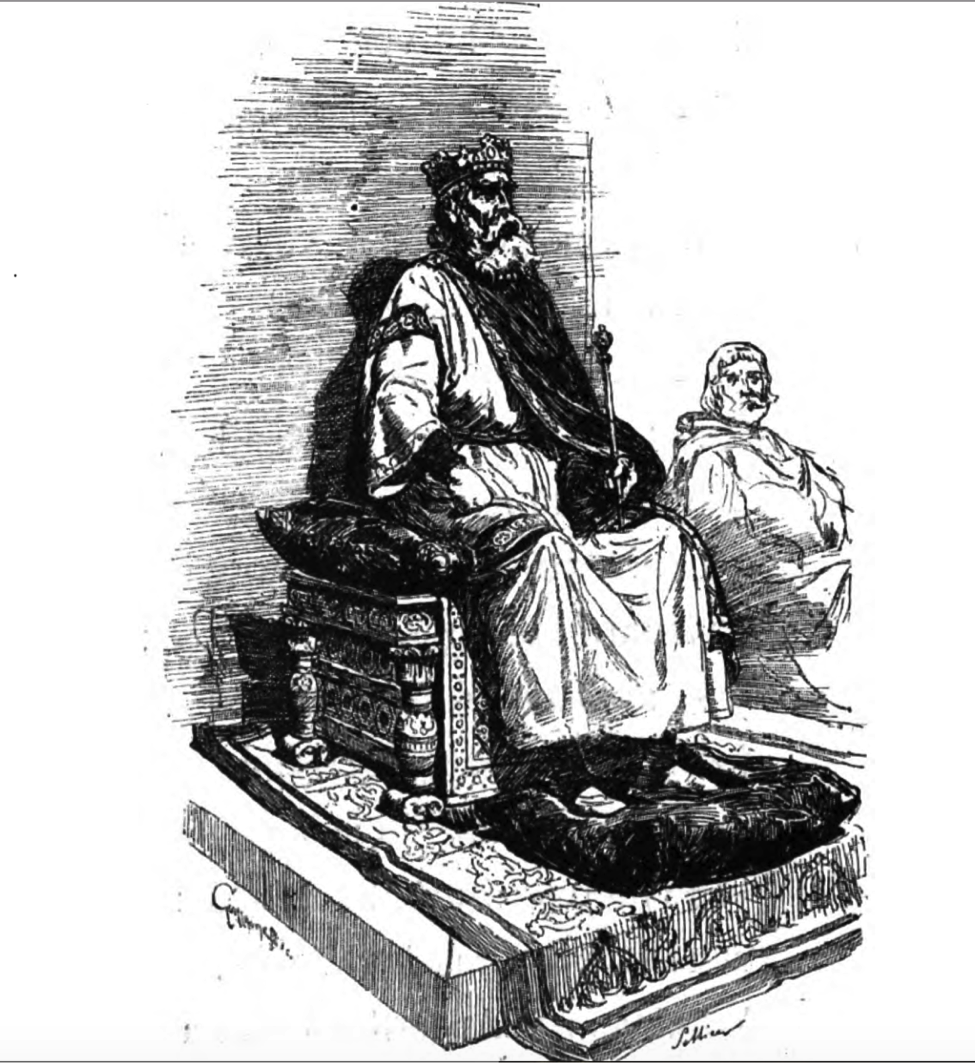 The man in this image is the king Fernando and he is sitting on his throne. He is wearing his crown and holding a sceptre in his right hand. He is wearing a white robe. On the right side of his robes there is a darker piece of clothing covering his right side. He has a beard. On his throne there is a cushion and a carpet at his feet. The carpet has patterns on it. Under his cushion on the throne, there seems to be another carpet similar to the one on the ground flowing down the throne.