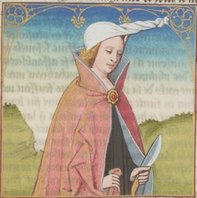 This illumination depicts a portrait of Portia, the daughter of Marcus Cato and wife of Brutus. Brutus was one of the people involved in the conspiracy to assassinate Julius Caesar. When Brutus told Portia of the conspiracy, she takes a barber’s knife and stabs her foot with it. She does this to prepare herself in case she has to kill herself should the conspiracy not work out in Brutus’ favour. Portia is depicted holding the razor in her hand in this image. She eventually kills herself by swallowing hot coals when she finds out that Brutus had died.