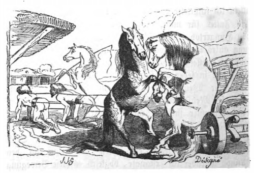 Here we see a vehicle similar to a sleigh drawn by four yahoos. A Houyhnhnm who injured his hoof sits on the sleigh, as it arrives to the house where Gulliver is staying. The sleigh is greeted by another Houyhnhnm, while another takes the yahoos to the stables to be fed. This scene turns the world upside down, as it is now humans who pull the sleighs and the horses riding in it, rather that the reverse. The same image appears in the 1839 Krabbe edition.