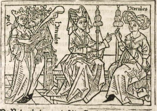 This engraving depicts the marriage between Iole, daughter of King Eurytus of Aetolia, and Hercules. The left-hand side of the engraving illustrates Hercules wrapped around Iole with a look of pure affection on his face. Iole is pictured not reciprocating the embrace. We know that these figures are Iole and Hercules as their names are engraved beside their bodies. Boccaccio explains that Iole is not in love with Hercules because he killed her father after he did not give Hercules permission to marry Iole. In order to seek her revenge on her husband for the murder of her father, Iole allowed Hercules to fall madly in love with her. By doing this, Iole was able to convince Hercules to do whatever she asked. She stripped him of his pride by getting him to dress as a woman and spin wool, which is depicted on the right-hand side of the engraving. As Hercules is unrecognizable in women’s clothing, the creator engraved Hercules’ name above his head to differentiate between him and Iole.