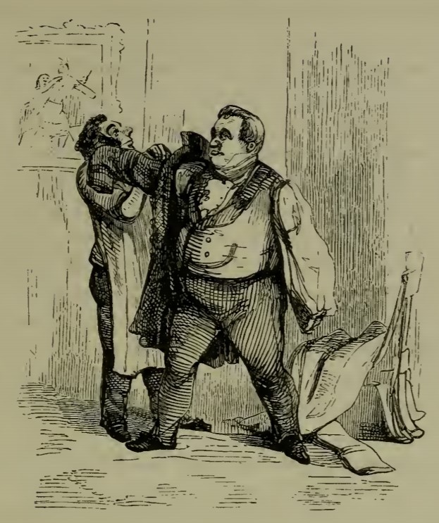 - Joseph Sedley puts on his coat with help from Isidor, his valet. He is intending to go out to discover for himself whether the rumors of Napoleon’s victory are true. Joseph is standing next to a chair over which another coat is draped, and on the wall behind Isidor hangs a large painting.