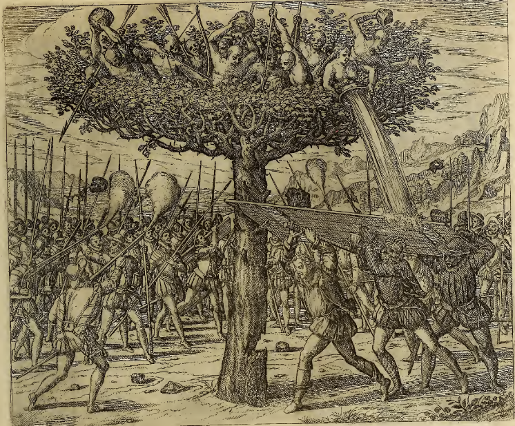 A group of Spaniards attack several Indigenous people in a tree in the Atrato river region of present-day Colombia. The Indigenous people of the region built homes in the treetops because the land around the river was quite swampy. The Indigenous people throw rocks and spears, fire arrows, and pour water onto the attackers on the ground below them, while the Spanish soldiers fire muskets up at them. Two Spaniards hold a large wooden board over the head of a third man, to protect him while he attempts to chop down the tree with a hatchet.