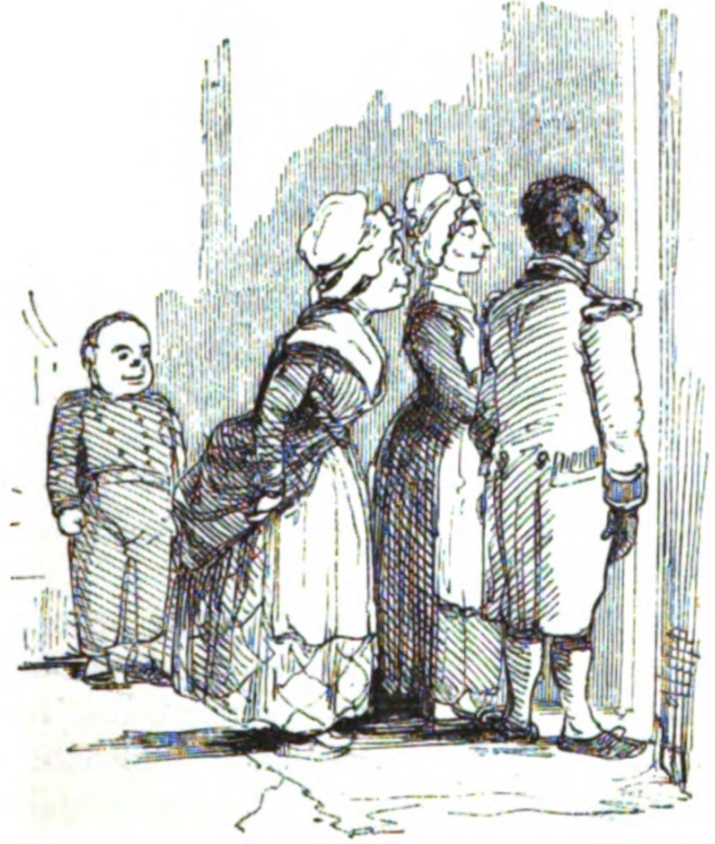 The footman Sambo, Mrs. Blenkinsop the housekeeper, and the cook stand at the landing-place outside the drawing room to listen to Rebecca Sharp sing. In the background is another figure in uniform, possibly a page boy.