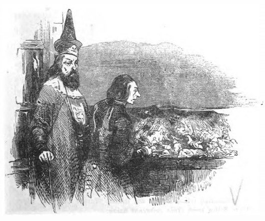 Here we see Gulliver and the Governor of Glubbdubdrib, who was a necromancer. The two men stand on a balcony and the Governor asked Gulliver what he wanted to see. Gulliver responded that he wished to see Alexander the Great after the battle of Arbela. Alexander appeared in the field under the balcony and called up to Gulliver, speaking Greek. Alexander said that he died of fever from excessive drinking, not by poisoning. Alexander the Great was a Macedonian King from 336-323 BCE. Alexander conquered Greece and Egypt and at the battle of Arbela he defeated Darius III, the King of Persia, in 331 BCE. Rumors at the time of his death said that he had been poisoned, however, Plutarch’s Lives, said that he died of fever, which Alexander corroborates, as this is a more honourable death than dying by poison. The same image appears in the 1839 Krabbe edition.