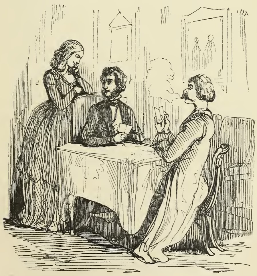 Rebecca Crawley learns against the back of George Osborne’s chair, flattering him about his appearance and teasing him about his bad habits. He is turned slightly to look at her, while Rawdon Crawley sits opposite him, smoking. The men are each holding two cards in their game of écarté.