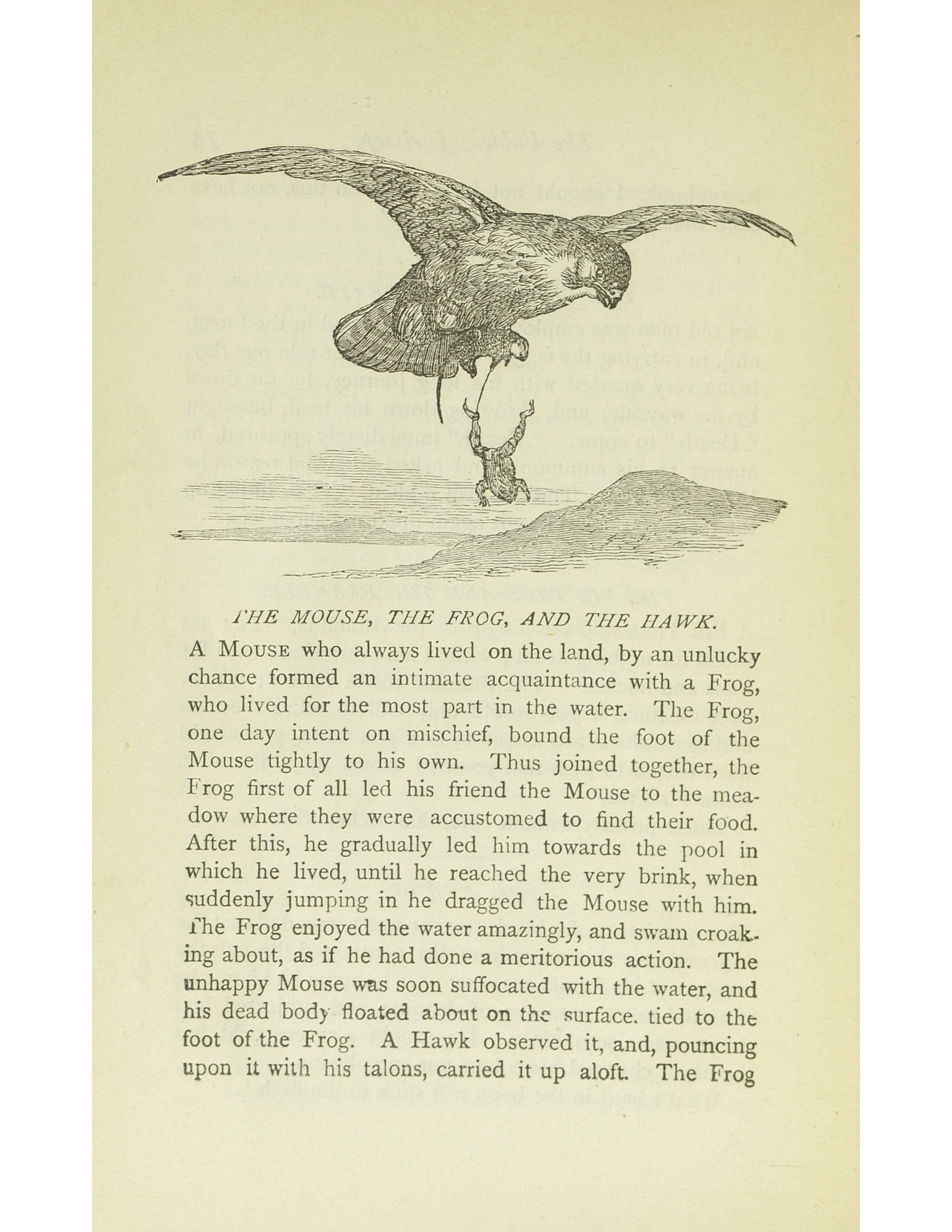 - In the sky, a hawk holds a small mouse in its left claw. A frog is falling, but it has a small rope tied around its leg and is being held up by the mouse. The hawk is looking below at the dangling frog, and it seems irritated. In the background, hills and clouds decorate the image.