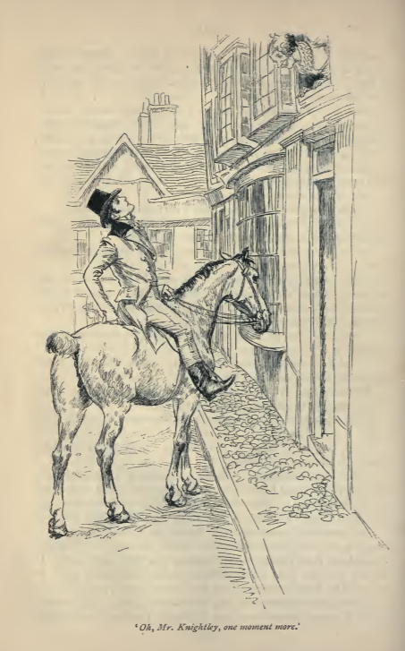 In this image Miss Bates leans out the window speaking to Mr. Knightley who was on horseback. Miss Bates saw him passing the house and, not wanting to cause a chill by opening the window in the drawing room where a group was gathered, went into another room to speak with him through the window. Miss Bates asked him to come in but he said he could not because he was on his way to Kingston. This scene occurs in chapter 27. The characters are shown in the traditional regency style. Miss Bates wears the regency style dress with an empire waist. Mr. Knightley wears a waistcoat and tailcoat, with a cravat and top hat. The regency period dated to the early nineteenth century (1811-1820) when George, Prince of Wales, later George IV (r. 1820-1830), reigned as regent for his mentally ill father, King George III (r. 1760-1820). The regency period is associated with the rise of neoclassicism in art and fashion.