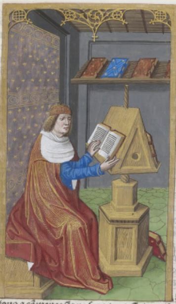 This image appears at the end of the book. It depicts man, presumably Giovanni Boccaccio, the author of the book, sitting in his study reading a book which is resting on a lectern. There are other books on a shelf in the background of the image. Giovanni Boccaccio was around forty-eight years old when he compiled the stories of the women in the book, which is why he looks slightly older in age in the image.