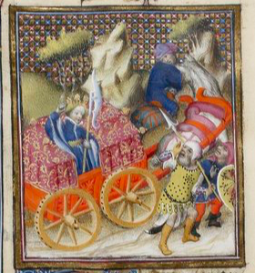 When Berenice found out about the murders of her two sons by Mithridates, she was devastated. In her grief, she sought out Mithridates to get revenge. When she found Caeneus, the king’s servant who committed her sons’ murders, she struck him to the ground with a rock and then ran over his body with her chariot. The image depicts Berenice in her chariot, surrounded by soldiers as she looks for the man who killed her sons. She holds a lance in one hand as a weapon, and in the other hand she holds the rock that would strike Caeneus to the ground. Caeneus is depicted in the yellow armor, looking up at Berenice.