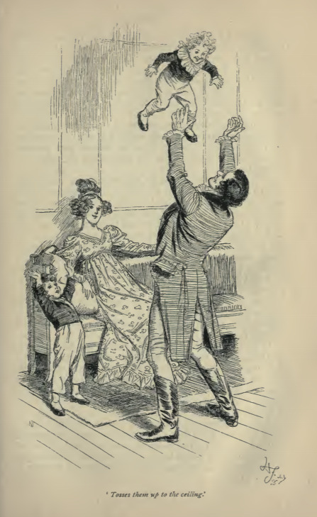 Here we see Mr. Knightley playing with his nephews, tossing one of his nephews into the air. Emma’s sister, Isabella, sits in front of Mr. Knightley. Isabella married Mr. Knightley’s younger brother, Mr. John Knightley. Mr. Woodhouse was always concerned that he played too rough with the boys, but Emma reassured him that they enjoyed it. This scene occurs in chapter 9. The characters are shown in the traditional regency style, with Isabella wearing a regency style dress with an empire waist. Mr. Knightley wears a waistcoat and tailcoat, with a cravat. The young boys wear short coats and breeches. The regency period dated to the early nineteenth century (1811-1820) when George, Prince of Wales, later George IV (r. 1820-1830), reigned as regent for his mentally ill father, King George III (r. 1760-1820). The regency period is associated with the rise of neoclassicism in art and fashion.