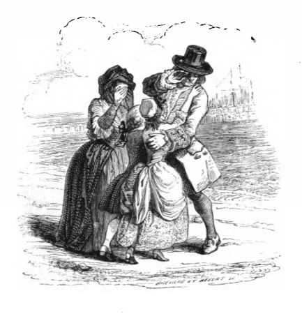 Here we see Gulliver saying goodbye to his family as he leaves for another voyage only two months after returning from Lilliput and Blefuscu. Everyone here is crying. Gulliver’s wife is on his left while his daughter and son hug him. In the background we see the docks and the ship that Gulliver was leaving on. The same image appears in the 1839 Krabbe edition.