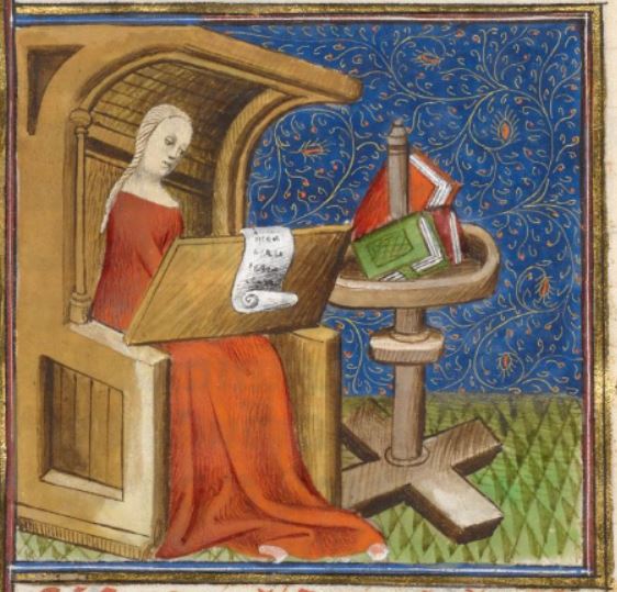 This illumination depicts Proba sitting in a chair as she looks at a book resting on a lectern. The books illustrated in the image are to represent her intellectual life and her teaching history to the world. Proba is renowned for her intellect and extensive knowledge of literature including works from Virgil. Proba had taken lines from the Aeneid, Bucolics, and the Georgics and transformed them into a cento focusing on the Old and New Testaments. Proba was said to have known the Scriptures by memory, which was something not even many men were able to do.