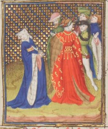 This illumination depicts a woman named Lucretia stabbing herself with a knife. There are people depicted on the right side of the image watching Lucretia carry out this act. Boccaccio explains that a relative of Lucretia’s husband (Collatinus) had raped her during the night. This man’s name was Sextus, and he had been welcomed into Lucretia and Collatinus’ home as a guest before he committed this crime. Lucretia told her husband, her father (Tricipitinus) and a relative named Brutus what Sextus had done to her. These are presumably the men illustrated on the right. After she told them what Sextus had done to her, she killed herself in shame of what happened.