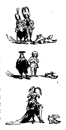 Here we see a triptych showing the separation between the Lilliputians and the Blefuscudians. In the first image we see the two emperors as friends, then they have an argument which we seen in the second image with the man further from the viewer crossing his arms and is standing in an aggressive stance. In the third image we are left with only the Lilliputian Emperor. In the first image, there are two shoes in different styles in front of the two men, one with a tall heel, the other with a small heel and a feather detail. In the second image only the shorter heel shoe remains, while in the third image only the higher heeled shoe is shown. The viewer is meant to understand that the argument between the two men was about the correct style of shoes. This is a thinly veiled reference to the religious wars of the sixteenth and seventeenth centuries. The same image appears in the 1839 Krabbe edition.
