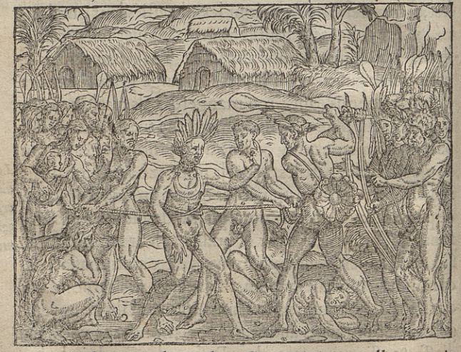 An Indigenous man has been taken captive by another Indigenous group and is about to be executed. He is restrained by a rope tied around his waist, with each end of the rope held taut. The captive wears a feathered headdress and a necklace. Another man stands beside him holding a club raised over his head, poised to swing. There is a body lying on the ground behind the man with the club. Groups of people stand on either side of the captive to watch the execution, most of the men hold bows or clubs and at least one woman has a small child in a sling against her chest. Another woman crouches beside the prisoner with her hands over her face in distress. Several structures are visible in the background. This image is identical to one found in Paris, 1557.