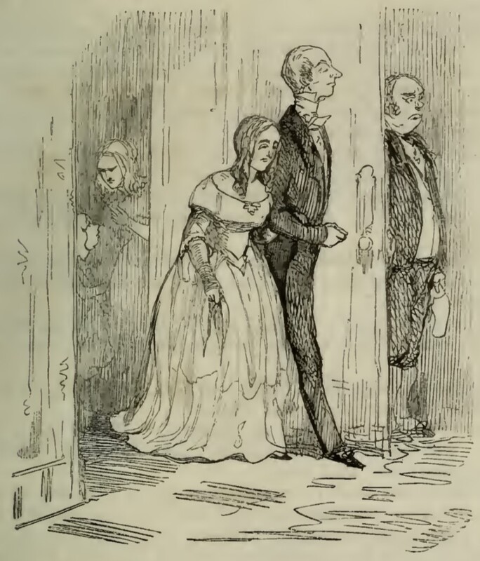Lady Rose Crawley, who looks worn down, enters the dining room on the arm of her son, Mr. Pitt Crawley. To the right of the picture, Sir Pitt Crawley stands behind the door, holding a jug in one hand. To the other side, through the open door, Rebecca Sharp can be seen talking to one of the Crawley daughters.