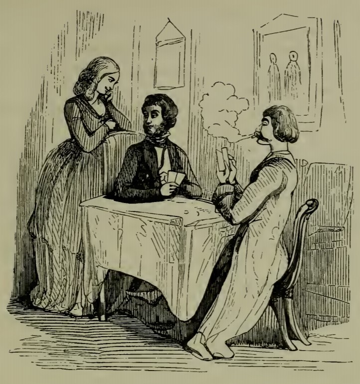 Rebecca Crawley learns against the back of George Osborne’s chair, flattering him about his appearance and teasing him about his bad habits. He is turned slightly to look at her, while Rawdon Crawley sits opposite him, smoking. The men are each holding two cards in their game of écarté.