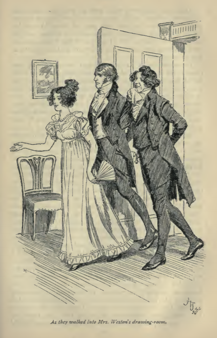 Here we see Emma, Mr. Elton, and Mr. John Knightley walking into Mrs. Weston’s drawing room for her Christmas party on December 24th. Emma leads the way with Mr. Elton looking cheerful, and Mr. John Knightley looking rather discontented, as he often felt. It was after this party that Mr. Elton proposed to Emma, and she turned him down. This scene occurs in chapter 14. The characters are shown in the traditional regency style, with Emma wearing the regency style dress with an empire waist. Her hair is worn up as was the fashion and carries a fan. A fan was often used at evening events by women to communicate with others across the room by moving or holding the fan in a specific manner. Mr. Elton and Mr. John Knightley wear waistcoats and tailcoats with cravats. The regency period dated to the early nineteenth century (1811-1820) when George, Prince of Wales, later George IV (r. 1820-1830), reigned as regent for his mentally ill father, King George III (r. 1760-1820). The regency period is associated with the rise of neoclassicism in art and fashion.