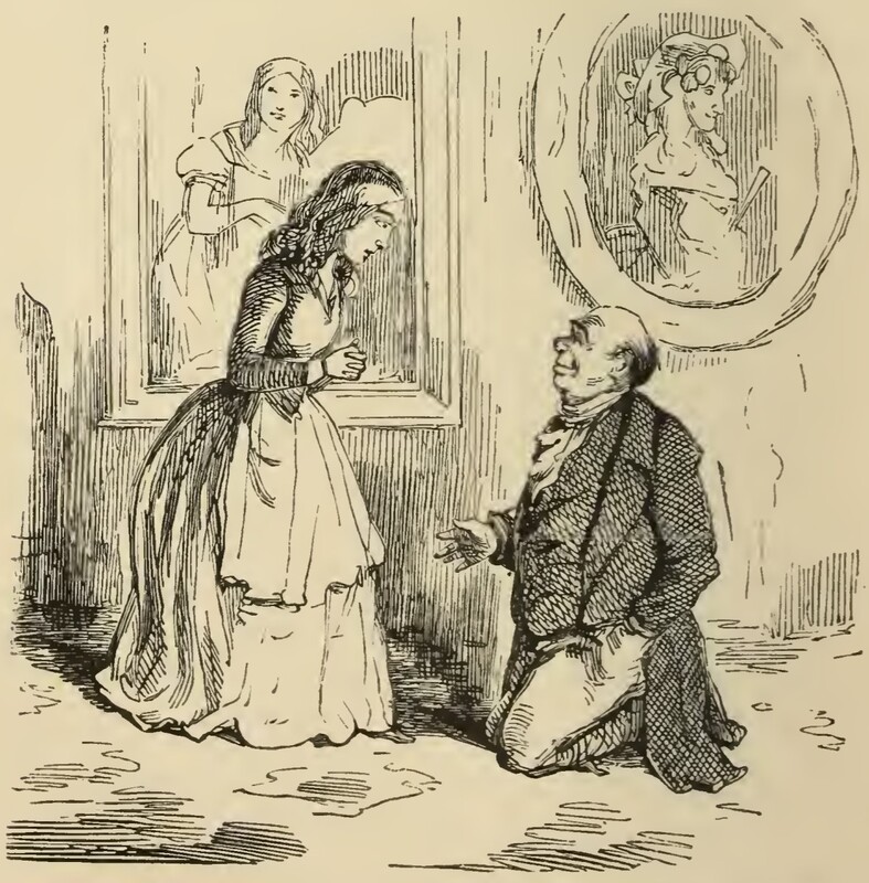 Sir Pitt Crawley kneels on the ground in his sister’s parlour, one hand extended towards Rebecca Sharp, who stands in front of him looking slightly startled. In the background are two life-sized portraits of women.