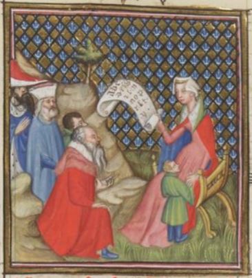 This image depicts Nicostrata, a woman who was a famous prophetess during her time, holding a scroll of parchment. She is illustrated sitting down on the right side of the image as a group of people are listening to her speak. She is teaching them a new language. Nicostrata had gone with her son Evander to Italy and he founded the city of Pallantium. Once Nicostrata realized that the inhabitants of this city were not well educated or literate, she decided to give them their own language with their own letters and symbols. This was the Latin language. Nicostrata taught the new letters and language to the people of Pallantium, which is what the illustration depicts.