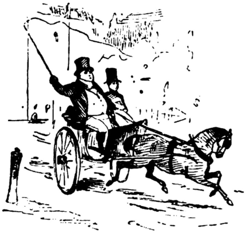 Joseph Sedley is seated in a small, open, two-wheeled carriage pulled by a single horse. He holds the reins in his left hand with the whip raised high in his right as the buggy passes a post. At his side is seated another, unspecified, male figure in a tall hat. In the background can be seen the outside of some trees and two buildings. Too nervous to go see Becky Sharp in the drawing-room, he has decided to see a performance of Forty Thieves instead.
