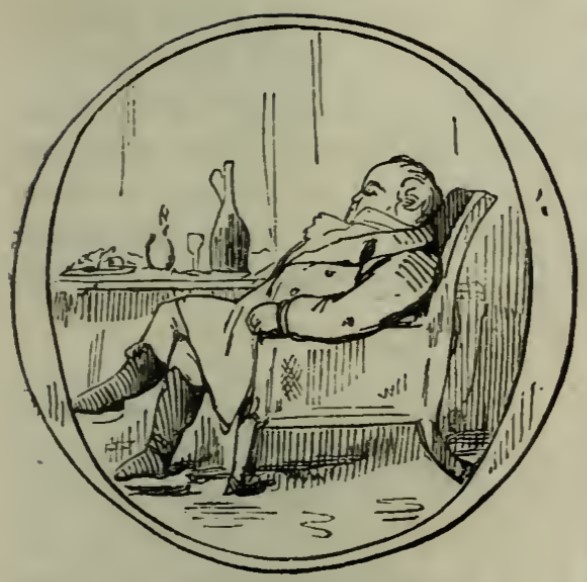 - Joseph Sedley is asleep at the dinner table, leaning back in his chair. On the table in front of him are the remains of dinner, including his plate and cup and a decanter. He is framed in the letter O from “On”.