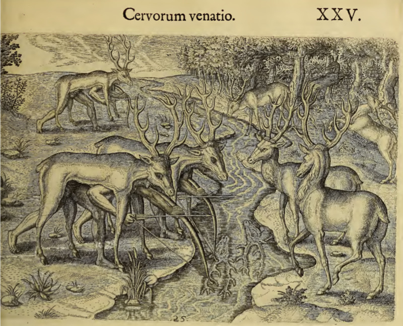 This image shows the Indigenous people’s method of hunting deer. Three individuals are hunting. They have taken the skin of deer previously killed and draped them over themselves as a disguise. They walk bent at the waist and hold bows and arrows in front of them. Across a small river, several deer stand watching the hunters.