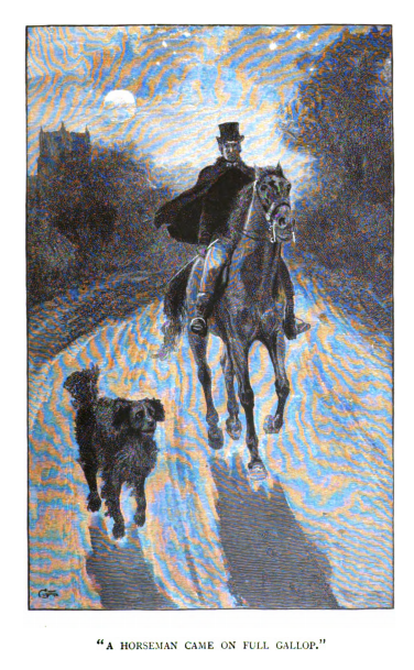 Here we see Mr. Rochester riding on horseback home to Thornfield late at night. His dog, Pilot, runs beside him. Thornfield is visible in the background. Jane was worried because Mr. Rochester was out so late, so she left the house to look for him. As she walked up the lane, Mr. Rochester arrived home, and pulled her up onto his horse with him.