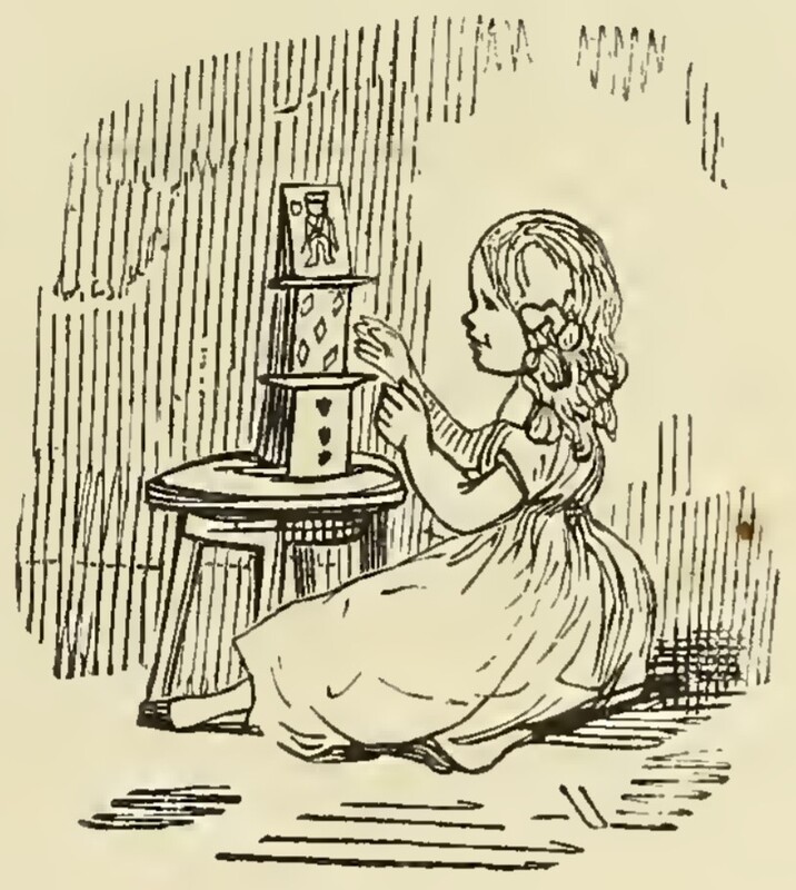 A small girl in a long dress, likely Rosalind or Violet Crawley, is seated on the floor. In front of her on a stool is a small card tower, three high, towards which she is reaching.