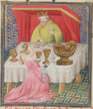 This illumination depicts a Dripetrua sitting at a dinner table with her father, King Mithridates of Pontus. They are both depicted wearing crowns. Boccaccio explains that Dripetrua was born with two sets of teeth and was incredibly hideous, however, she was also very devoted to her father, which deserved praise.