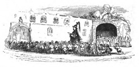 Here we see a procession where the Lilliputian Emperor walks through a crowd of kneeling Lilliputians. The Emperor is identified by his elaborate headpiece which has a long train coming out of the top. The Emperor walks towards the gates to the palace, with the crowd lining the walkway towards the gate. The same image appears in both the 1839 and 1843 Krabbe editions.
