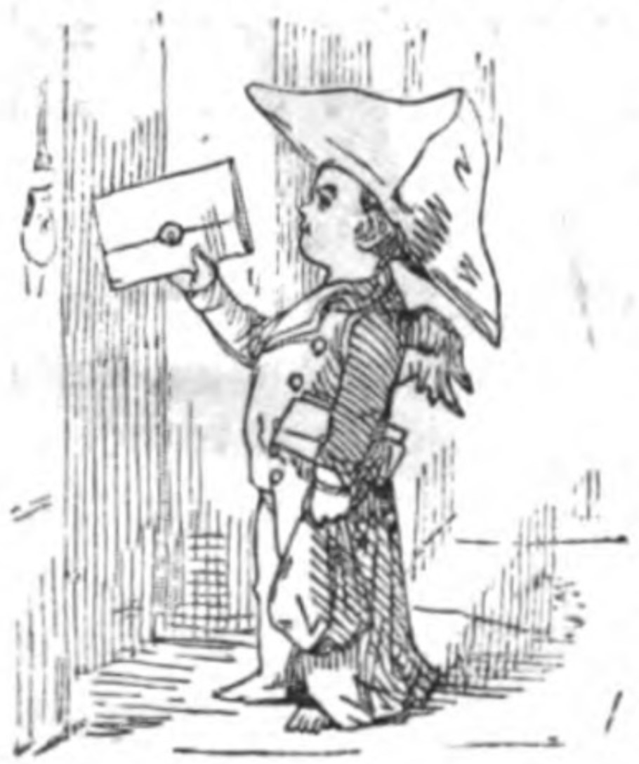 A small boy in a uniform and triangular hat with a pair of tiny angel wings holds a packet of sealed correspondence out to a doorway, most likely a letter from Amelia Sedley to George Osborne. The boy has a bag in his other hand and more letters tucked under his arm.