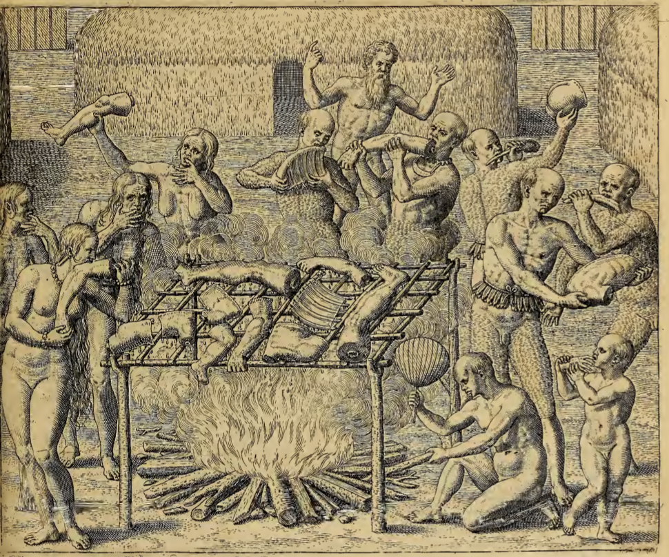 In a Tupinambá village, a large wooden frame has been set up over a bonfire, and several human body parts have been set upon the frame to roast over the fire. A group of men, women and children stand around the fire eating various human body parts, including legs, arms, ribs, and hands. Behind the fire a bearded European man stands with his hands in the air, perhaps in dismay or distress.