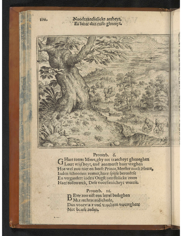 - A cricket sits near a tree with ants; in the background there is a farm and a man on a horse; Dutch letterpress on verso; illustration to Eduwaert de Dene's edition of Aesop's Fables, De Warachtighe Fabulen der Dieren (Pieter de Clerck, Bruges: 1567). c.1567Etching