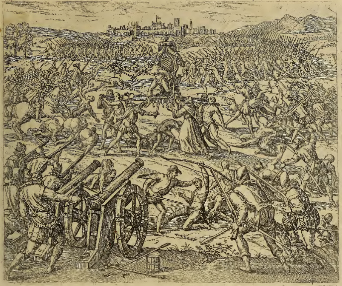 The Inca Emperor Atahualpa (Atabalipa) and his army are attacked by Spaniards outside the city of Cajamarca in Peru. At the center of the melee, a Spanish man grabs Atahualpa (who is still atop his litter) by the ankle and pulls him down, while a monk holds a cross up towards him. Spaniards attack the Inca army on horseback from the left and on foot from the right, using muskets, swords, and spears. The Spanish have also lined up several cannons, which they fire at the Indigenous warriors. Despite outnumbering the Spanish, the Inca army is faring poorly, having been caught by surprise and facing more destructive weapons. The Inca men are armed with bows and spears, and a few have shields. Many are killed in the attack, while others flee in panic. This image is identical to one found on page 7 (123) of Frankfurt, 1596.