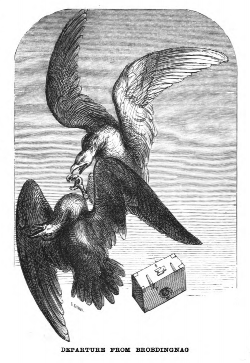 Here we see Gulliver’s house being carried away from Brobdingnag by an eagle. The eagle carrying Gulliver’s house was attacked by another eagle causing it to drop Gulliver’s house the house into the water, seen here.