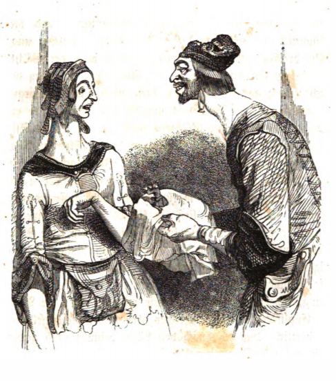 Here we see the farmer giant who discovered Gulliver presenting him to his wife. The farmer holds Gulliver on a cloth. Gulliver kneels on the cloth in front of the woman with his arms out towards her. The woman wears a dress with a pocket hanging in front of her. Her hair is covered with a cap. She looks surprised by Gulliver and holds her left arm close to her as though she is alarmed or put off by Gulliver. The same image appears in the 1843 Krabbe edition.
