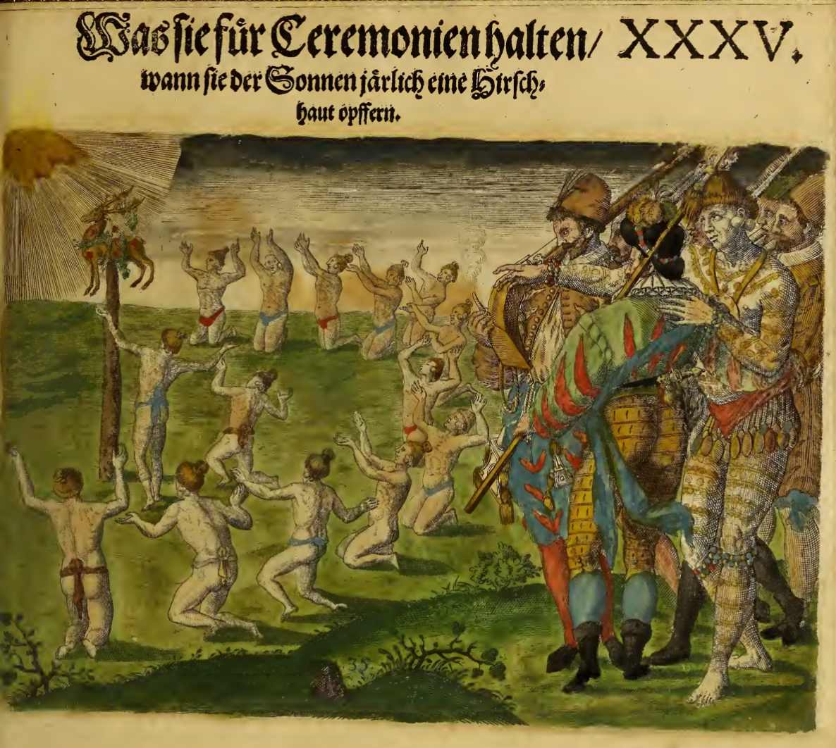 In the foreground, several colonists stand with an Indigenous man. The Indigenous man wears an adorned loincloth and bracelets around his wrists and knees. His skin is covered in tattooed or painted designs. To the left of the men, a group of Indigenous people kneel on the ground in a semi-circle with their arms outstretched or raised above their heads. At the center of the circle there is a log standing on end. Two Indigenous people are beside it, one standing and one kneeling, both with their arms raised. In the upper left corner, the sun is shown, with the remains of a deer in the sun beams. This illustration is identical to the one found on page 113 of Frankfurt 1591, but colored.