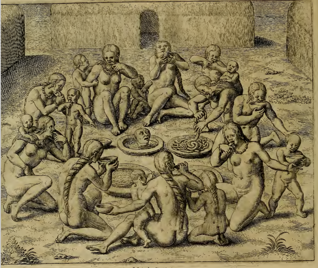 A group of women and children sit in a circle with several large dishes at the center. One of the dishes holds a human head and another holds entrails. Some of the women and children sip from bowls while others use their hands to eat. Two of the women have infants strapped to their backs in baskets or slings.