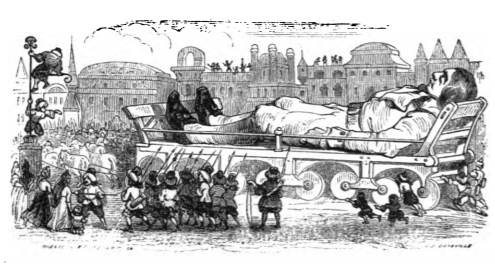 [Gulliver being brought into the town from the shore on a gurney in Lilliput]