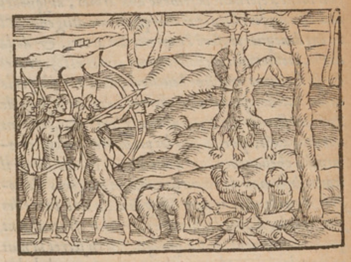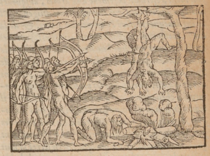 Two men have been captured by the Indigenous Brazilian warrior women, a group which the author calls ‘Amazons’. The men have been hung upside down by one ankle from a tree, and a fire has been lit beneath them. The women shoot arrows at the hanging men. This illustration is a simplified and mirrored version of the one found on page 126 verso of Paris, 1557.