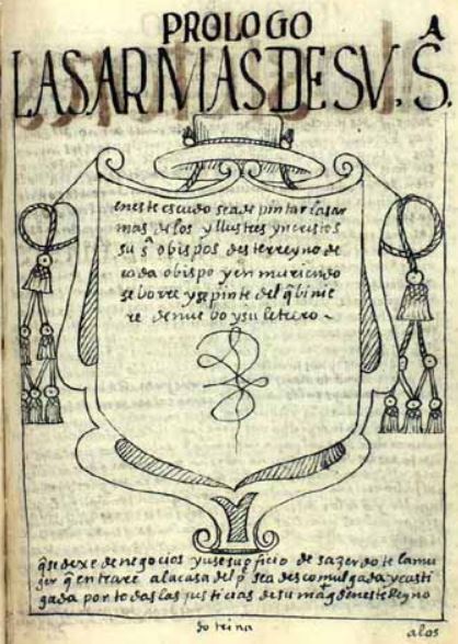 This image depicts the coat of arms of the bishops of Peru. The author placed this image before a prologue addressing the priests of Peru on how to act according to their religious duties. The writing inside the coat of arms reads, “en este escudo se a de pintar las armas de los yllustres yn cristos su senoría obispos deste rreyno de cada obispo, y, en muriendo, se borre y se pinte del que biniere de nuebo y su letrero” [This is the coat of arms of the illustrious bishops of Christ in this kingdom of the Earth. And in death, the one who comes again his sign is erased and painted]. The caption at the bottom of the image reads, “que se dexe de negocios y use su oficio de sazerdote, la muger que entrare a la casa del padre sea descomulgada y castigada por todas las justicias de su magestad en este rreyno” [he owes business and uses his office as priest. The woman who enters the priest’s house is disgraced and punished by all the justices of her majesty in the kingdom].