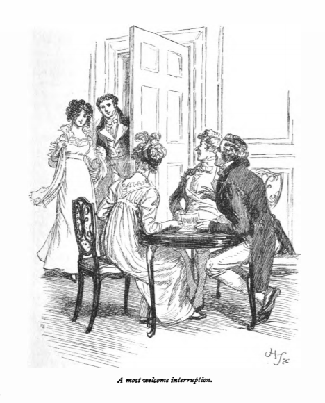 Here we see Tom, Maria, and Mr. Yates sitting in the drawing room at Mansfield Park, when Mr. And Miss Crawford came in. The group discussed the play, “Lover’s Vows” that they decided to put on before Sir Thomas came home. This scene occurs in chapter 15. The characters are shown in the traditional regency style. Maria and Miss Crawford wear the regency style dresses with empire waistlines. Mr. Rushworth, Mr. Yates, and Tom wear waistcoats and tailcoats, with breeches and cravats. The regency period dated to the early nineteenth century (1811-1820) when George, Prince of Wales, later George IV (r. 1820-1830), reigned as regent for his mentally ill father, King George III (r. 1760-1820). The regency period is associated with the rise of neoclassicism in art and fashion.