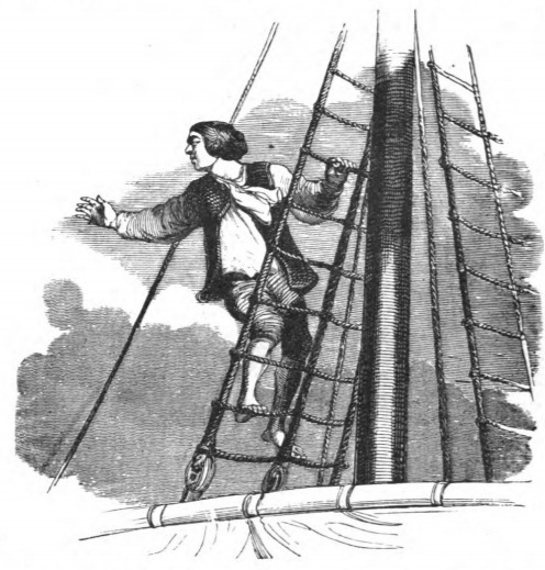 In this image we see a cabin boy from Gulliver’s ship first seeing Brobdingnag. He climbs one of two rope ladders up the mast. He waves down to others on the deck to signal his discovery to the others on the ship. The boy is barefoot and wears short pants and a loose shirt. Just below his feet we see the top of one of the sails. The same image appears in both the 1839 and 1843 Krabbe editions.