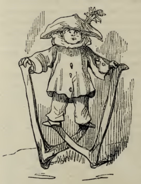- A figure in oversized clothes and a feather hat stands on a pair of crossed stilts, which form the letter W from “When”.