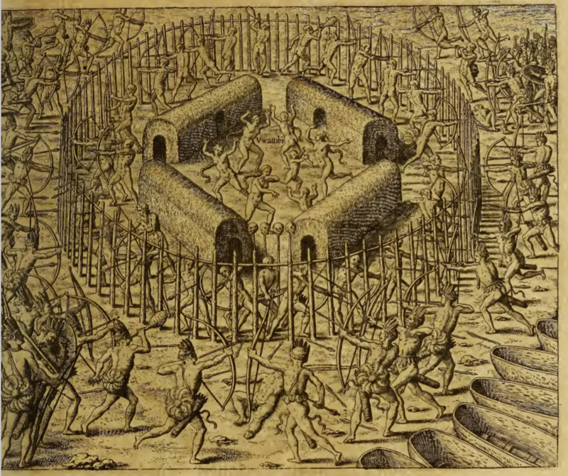 A Brazilian Indigenous group attacks the Tupinambá village 'Uwattibi'. The attcking group have arrived in canoes, which are pulled up along the shore on the right. They have surrounded the village and shoot arrows through and over the fence. These men wear feathered headdress and adornments around their waists, most carry bows and have arrows quivers slung around their shoulders, and a few also carry a shield. Several people, both in the attacking group and inside the village, blow into an object, perhaps a wind instrument or blow gun. Inside the village, Tupinambá men stand just inside the fence shooting arrows out towards the attacking group. The women and children in the center of the village run in panic.