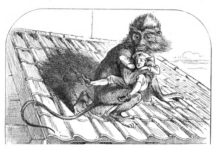 Here we see the scene in which a monkey from Brobdingnag got loose and caught Gulliver. The monkey belonged to a member of the kitchen staff of the King and Queen of Brobdingnag. The monkey found Gulliver’s house and reached in and grabbed Gulliver, carrying Gulliver up to the roof and tried to feed Gulliver.