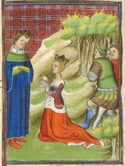 This illumination depicts the queen of the Galatians kneeling in the centre of the image holding a decapitated head. This woman’s name is unknown; however, she is the wife of King Drigiagon. After being taken as a captive by Roman enemies, the Galatian queen was defiled by a Roman centurion. To seek her vengeance, once she was freed through ransom, she ordered her servant to decapitate the centurion. The Galatian queen is holding the severed head as she presents it to her husband to prove that she was defiled by this man.