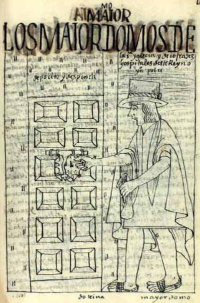 This image depicts an indigenous mayordomo [chief attendant/steward] inserting a key into a lock to open a large door. The mayordomo is illustrated holding a bag of money in his left hand. There are words written on the door that he is opening which reads, “depocito y despensa” [deposit and storeroom]. The mayordomo was responsible for handling day-to-day operations and administration of rural parishes in colonial Peru.