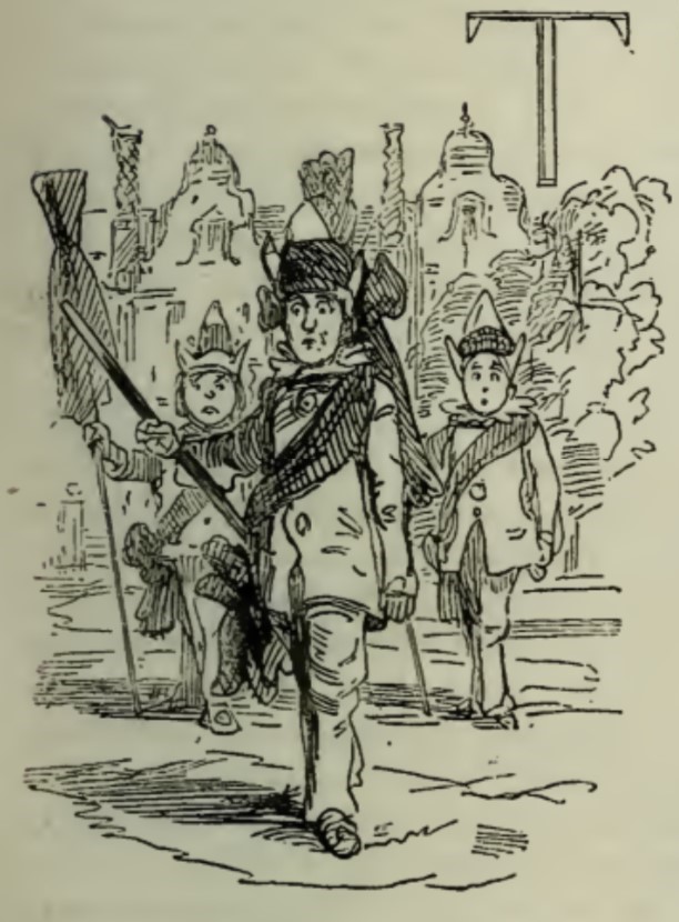 Three figures in sashes and pointed hats, holding poles, stand in formation before curved-roof buildings. In the top right corner of the image is the letter T from “The”.